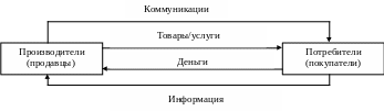 Отношение производителя и потребителя (продавца и покупателя) можно разделить на четыре составляющие: со стороны производителей (продавцов) — потоки товаров/услуг и коммуникаций (реклама, стимулирование сбыта и т.п.), навстречу — деньги и информация (данные о продажах, отношение потребителей к товару и т.п.).