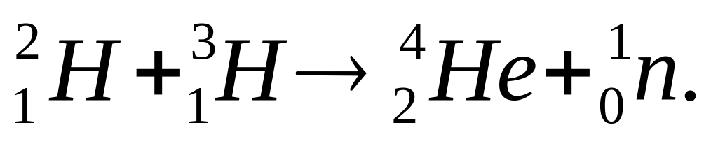 Возможны ядерные реакции синтеза или термоядерные реакции, когда из двух легких ядер образуется одно более тяжелое ядро. Например, синтез ядер изотопов водорода – дейтерия и трития и образование ядра гелия: