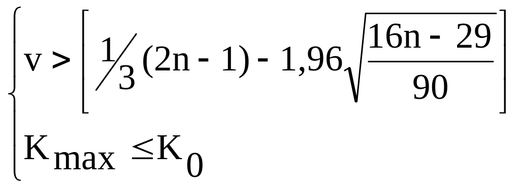Подсчитаем протяженность самой длинной серии Kmax и общее число серий v. Для того чтобы исходный ряд подставлял случайную выборку, протяженность самой длинной серии не должна быть слишком большой, а общее число серий – слишком маленьким. Выборка признается случайной, если выполняются следующие неравенства для 5%-ного уровня значимости: