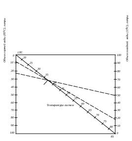В уравнении (2.1) две величины неизвестны Vг и V1 . Для удобства расчетов применяется номограмма рис.2.1. Например, для того, чтобы установить какое количество горячей и холодной воды потребуется для двух кратного приема душа (примем Vсм,=76 л tсм =370С), надо на прямой «температура смеси» найти точку 370С и провести через нее множество прямых. Так как сумма объемов холодной и горячей воды должна быть примерно 76 л, выбирается именно та прямая, которая показана на рис 2.1. Тогда получим, что горячей воды с температурой 850С нужно 26 л, а холодной – 50 л. Таким образом, подсчитав часовой расход горячей воды с температурой, tсм по номограмме находим часовой расход воды через ЭВН с температурой 850С.