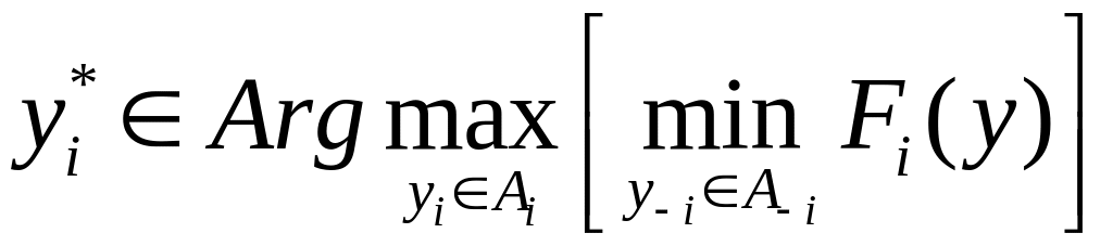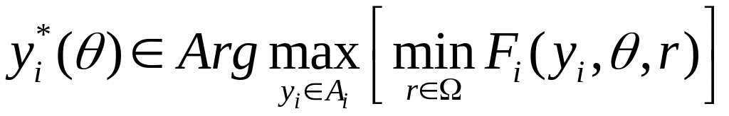 Другими словами, для того, чтобы найти гарантирующую стратегию i-го игрока, необходимо при фиксированных известных параметрах q найти минимум функции выигрыша по неизвестным параметрам r , а затем максимизировать результат минимизации выбором действия yi. Стратегия yi*(), на которой достигается максимум, и будет гарантирующей.
