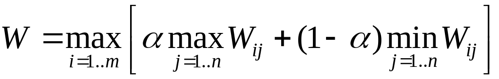 где параметр принимает значение от 0 до 1 и выступает как коэффициент оптимизма. К примеру, при =0 (полный пессимизм) критерий Гурвица превращается в критерий Вальда, при =0.5 мы расцениваем равновероятно шансы на успех и неудачу, при =0.2 мы более осторожны и вероятность успеха считаем меньшей (0.2) чем возможную неудачу.
