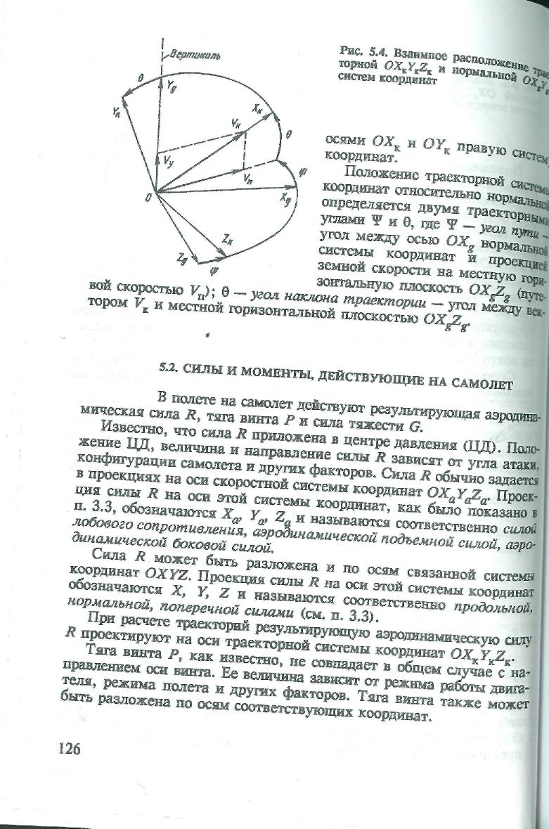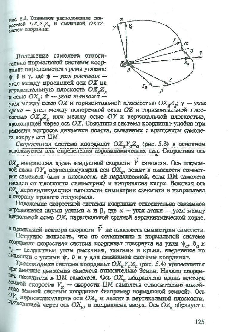 Траекторная система координат ОХк Ук Zк (Григорьев, рис. 5.4) применяется при анализе движения самолета относи- тельно Земли, начало ее координат находится в ЦМ самолета, а ось ОХк направлена вдоль вектора земной скорости «Vк» - скорости ЦМ самолета относительно какой либо земной системы координат (например нормальной земной).