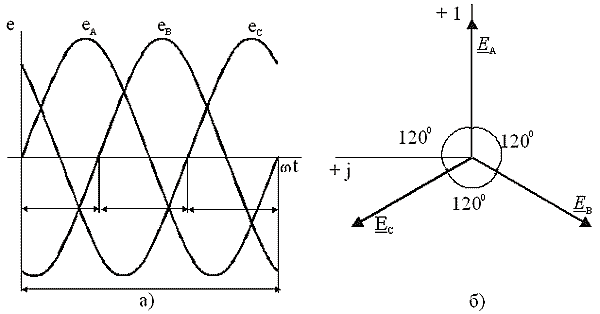 Рис. 4.1 – Диаграммы ЭДС трехфазной системы: а) временная; б) векторная