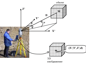 Сканер представляет собой устройство, объединяющее в себе теодолит, лазерный дальномер и цифровую камеру. Таким образом, для любой точки объекта, регистрируются горизонтальный и вертикальный углы с помощью теодолита, расстояние D с помощью лазерного дальномера и плотность изображения d с помощью цифровой камеры (сенсора) (рис.1).