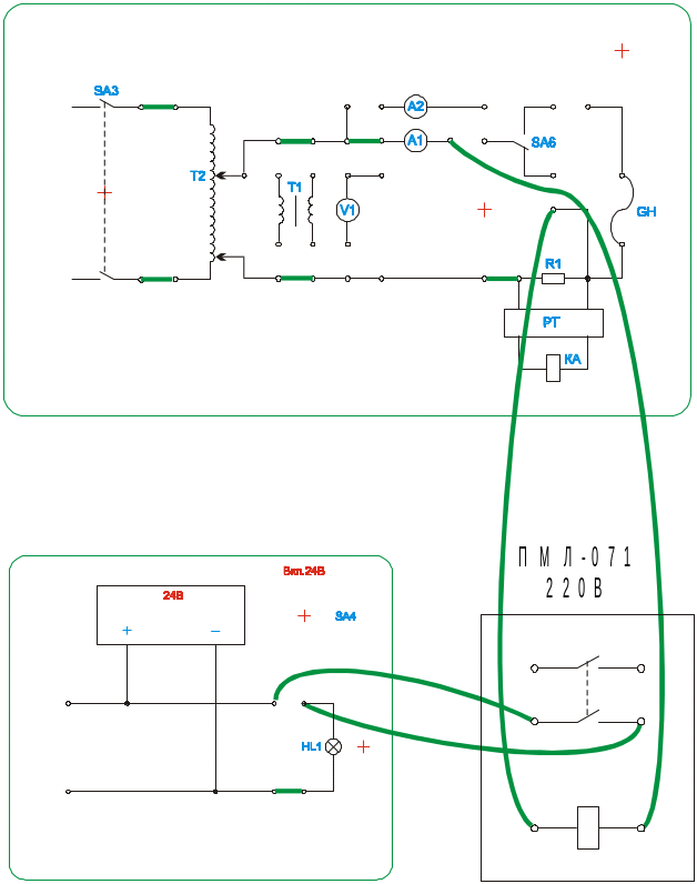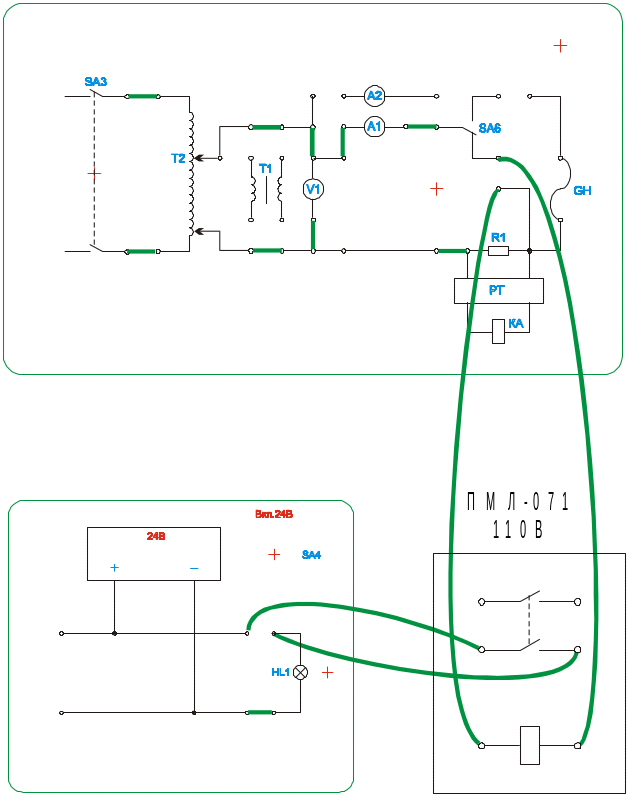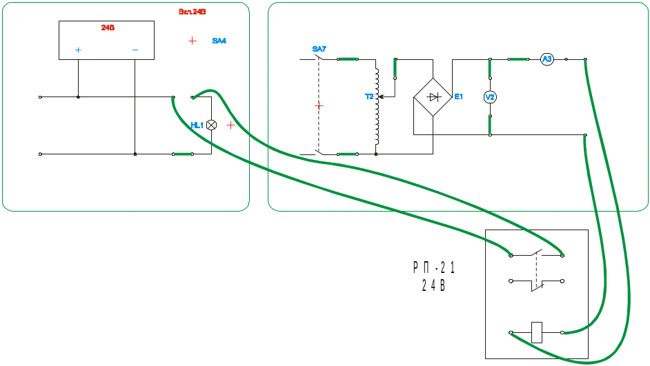2.3.5. Для исследования свойств промежуточных реле постоянного тока с номинальным напряжением катушки 24В необходимо собрать схему согласно рис. 2.4.