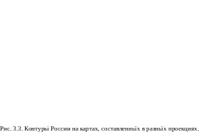 Иногда искажения картографических проекций очень замет-ньі, например очертания материков вьіглядят непривьічно вьітя-нутьіми или сплющенньїми, а другие части изображения стано-вятся раздутьіми. Есть картьі, на которьіх Гренландия больше Южной Америки, хотя, в действительности, она меньше ее в восемь с лишним раз, а Антарктида иногда вообще занимает весь юг картьі. Искажаются не только размерьі, но и формьі обьектов. На рис. 3.3 дан контур России в трех разньїх проекциях, и видно, что в одном случае очертания Чукотки как бьі «задраньї» кверху, в другом — находятся на уровне полуострова Таймьір, а в третьем — опущеньї книзу. На самом же деле, именно на Таймьіре находится северная оконечность России — мьіс Челюскин.