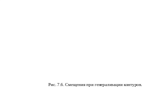 Еще более возрастают сдвиги, смещения и иньїе искажения при автоматической генерализации, когда обобщение проводят по не-которьім формальним алгоритмам. Иногда для зтого задают «шаг» осреднения извилистой линии или вьіполняют сглаживание посред-ством аппроксимации, т.е. приближения геометрически неправиль-ной линии (формьі) с помощью некоторой математической кривой (рис. 7.8). Генерализованная линия или контур нередко оказьіваются сдвинутьіми относительно их положення на исходной карте.