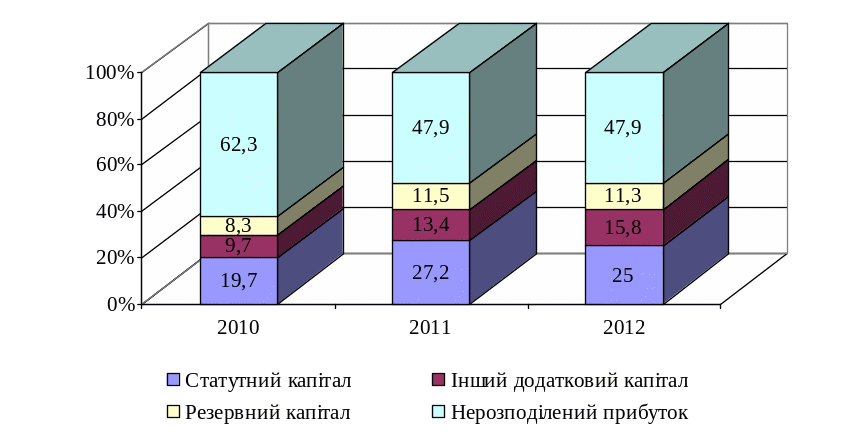 Також необхідно зазначити, що в структурі капіталу підприємства протягом 2010-2012 років відбулися певні зміни. Зокрема розмір власного капіталу зменшився за аналізований період з 186839 тис. грн. до 147247,5 тис. грн., що у відносному значенні становило 21,2 %.