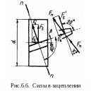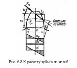 Расчет зубьев на изгиб выполняют для определения основного параметра зубьев – модуля зацепления m, а также для проверки прочности зубьев на излом. Максимальные напряжения изгиба возникают у основания зуба, в тот момент, когда сила приложена к его вершине и передается одной парой зубьев (рис.6.8). Зуб будем рассматривать как консольную балку, нагруженную в вершине нормальной силой Fn, которую разложим на две составляющие: