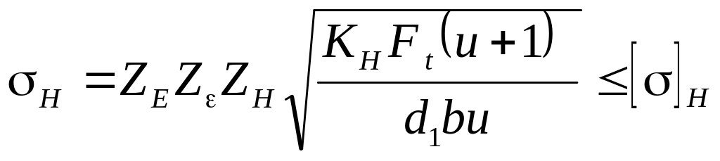 где ZЕ – коэффициент, учитывающий механические свойства материалов шестерни и колеса; Z – коэффициент, учитывающий суммарную длину контактных линий; ZН – коэффициент, учитывающий форму сопряженных поверхностей зубьев; КН – коэффициент нагрузки (учитывает динамическую нагрузку и неравномерность распределения нагрузки по ширине зуба и между зубьями); Ft – окружная сила на делительном диаметре d1; b – ширина венца колеса; u – передаточное число.