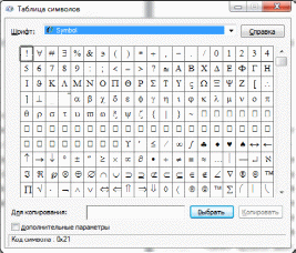 Иногда возникает потребность ввести в текстовый документ какой-либо отсутствующий на самой клавиатуре символ. В таком случае пригодится специальная программа – Таблица символов. (Рисунок 1.5) С ее помощью можно выбрать любой символ из имеющихся в шрифте. Для этого следует либо указать нужный символ и нажать Enter, либо дважды щелкнуть по нему мышкой. Если щелкнуть только один раз или перемещаться по таблице при помощи стрелок, то текущий выбранный символ будет отображаться увеличенным в собственном окошке.