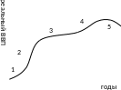 Фазы: 1 – нововведение, 2 – рост, 3, 4 – стагнация, 5 – спад, или спад, депрессия, оживление и подъем.