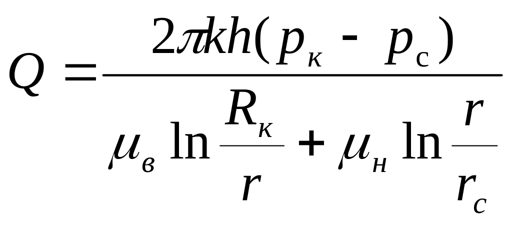 Из приведенной формулы видно, что дебит нефти при заданных постоянных значениях рн и рг возрастает при продвижении границы раздела, если н>в.