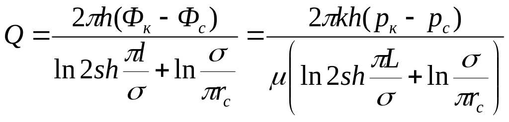Дебит каждой скважины бесконечной цепочки, расположенной на расстоянии L от прямолинейного контура питания (рис. 12), выражается формулой