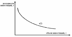 Доходность инвестиций может быть различной в зависимости от вида деятельности, размера фирмы или других факторов. Но существует общая закономерность – с увеличением объема инвестиций доходность снижается. Попробуем обосновать это на примере отдельного предприятия. Любая фирма может располагать разнообразными возможностями по инвестированию средств – различающимися, в том числе и по доходности. Исходя из стремления к максимизации прибыли, фирма реализует в первую очередь наиболее выгодные проекты – однако возможности получения высоких доходов ограничены, и при расширении объема инвестиций внедряются менее выгодные проекты. Закон снижения доходности инвестиций является проявлением наиболее общего экономического закона – закона снижающейся предельной производительности фактора производства. На рисунке 1 представлена типичная кривая зависимости доходности инвестиций отдельной фирмы от их объема, – кривая предельной эффективности инвестиций.