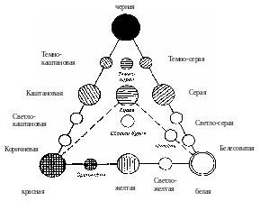 Различное сочетание указанных трех групп веществ определяет большое разнообразие почвенных цветов и оттенков. Для цветовых определений С.А.Захаров предложил треугольник цветов (рис. 5).
