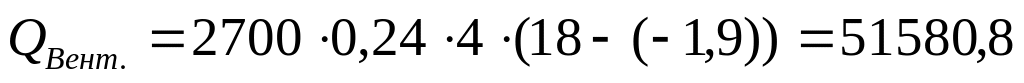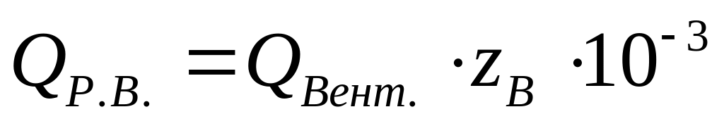 де V – об’єм приміщення, що вентилюється, – 2700 м3; с – питома теплоємність повітря, 0,24 ккал/м3С; m/ – кратність обміну повітря за 1 годину, 3 5;