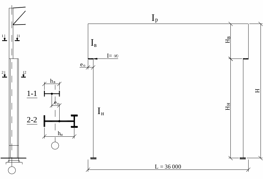 Расчетная схема однопролетной рамы с жестким защемлением ригеля в ступенчатых колоннах. Оси стоек в расчетной схеме совпадают с центрами тяжести верхнего и нижнего сечений колонны. В ступенчатых колоннах крайних рядов центры тяжести верхней нижней частей расположены не на одной оси, поэтому стойка рамы имеет горизонтальный уступ, равный расстоянию между геометрическими осями колонн. Заделка стоек принимается на уровне базы, ось ригеля совмещается с нижним поясом стропильной фермы.