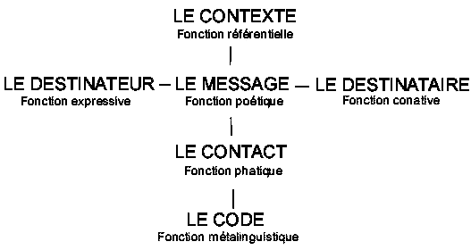 В модели коммуникации или речевого события, по Якобсону, участвуют адресант иадресат, от первого ко второму направляется сообщение, которое написано с помощью кода, контекст в модели Якобсона связан с содержанием сообщения, с информацией, им передаваемой, понятие контакта связано с регулятивным аспектом коммуникации. На следующем рисунке изображена модель коммуникации и функций языка и других коммуникативных систем в интерпретации одного из французских сайтов, посвященных журналистике, политике, теории массовой информации и коммуникации: |
