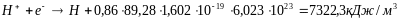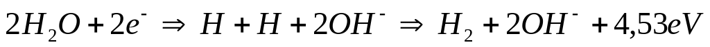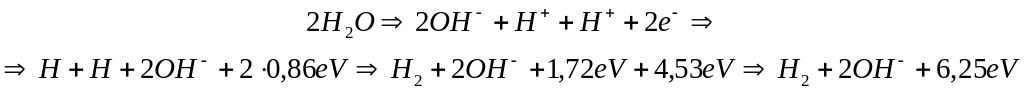 Как видно (рис. 92), в этом случае на термическое разрушение двух связей в молекулах воды расходуется (1,48х2)=2,96eV. При синтезе одной молекулы водорода выделяется 4,53eV энергии. На катоде в этом случае протекает реакция