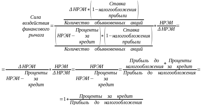 Американские ученые трактуют эффект финансового рычага как процентное изменение чистой прибыли на каждую обыкновенную акцию, порождаемое данным процентным изменением прибыли до уплаты процентов за кредит и налога на прибыль (так называемого нетто-результата эксплуатации инвестиций - НРЭИ):