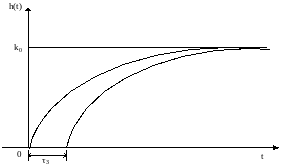 При осуществлении аналитического приближения найдённой экспериментальным путем передаточной функции исследуемого объекта или системы может оказаться необходимым ввести одно или несколько звеньев с запаздыванием. Реальные звенья запаздывания чаще всего встречаются в системах из-за наличия транспортного запаздывания движущихся изделий. Но иногда понятие запаздывания оказывается полезным для построения приближенной модели сложного процесса, строгое математическое описание которого затруднительно [12,47,48]. В этих случаях переходные функции могут иметь вид, показанный на рис. 5.1.