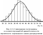 Сравнение фактических и теоретических частот в табл.2.13 показывает их сходство. Можно совместить частоты на одном графике, построив гистограмму по фактическим частотам n, а кривую плотности вероятности – по теоретическим частотам nт (рис.2.13).