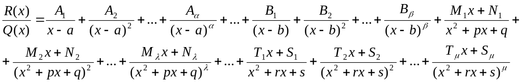 Для нахождения величин Ai, Bi, Mi, Ni, Тi, Si применяют так называемый метод неопределенных коэффициентов (суть которого состоит в том, что для того, чтобы два многочлена были тождественно равны, необходимо и достаточно, чтобы были равны коэффициенты при одинаковых степенях х).