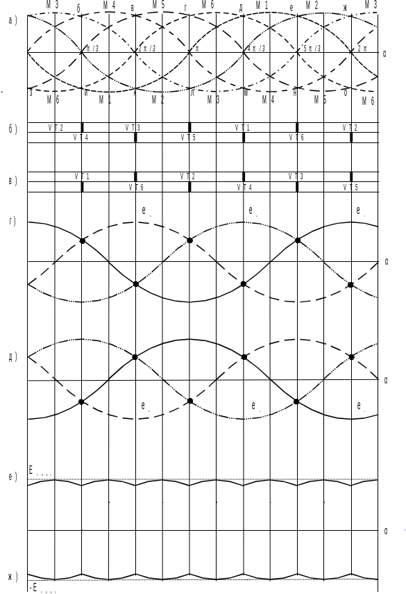 Кривые суммарной противо – ЭДС двигателя для двигательного и тормозного режимов приведены на рис. 4е, 4ж. Они получены на каждом интервале работы ключей как разность мгновенных значений ЭДС фаз двигателя, подключенных к источнику открытыми ключами.