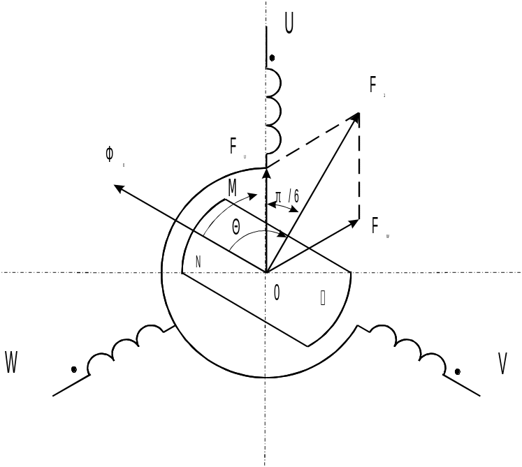 Здесь Fu1, Fv1, Fw – векторы намагничивающих сил фазных обмоток, имеющие направления, указанные на рис. 3 при протекании тока от начала к концу фазной обмотки.
