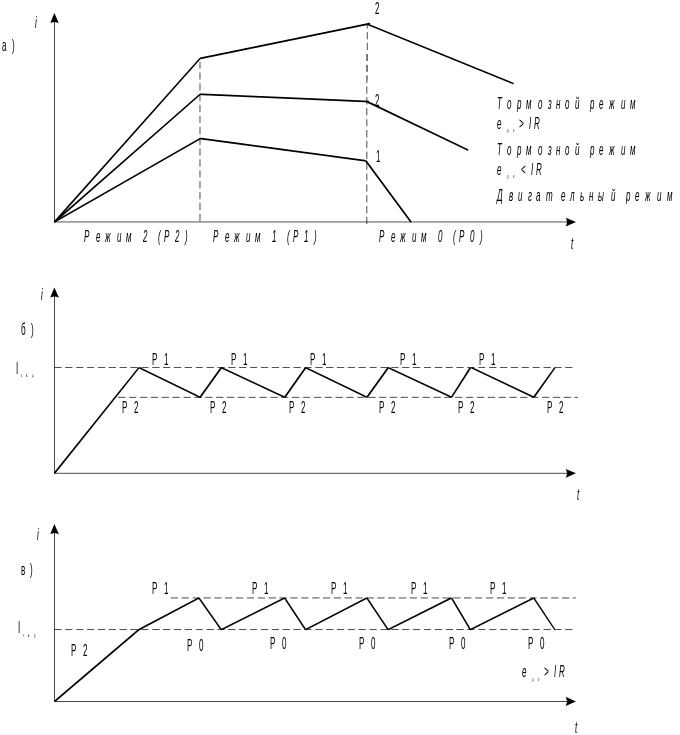 Для поддержания постоянства заданного тока в двигательном режиме и в тормозном при малых скоростях достаточно чередовать режим Р2 и Р1 (рис. 5б), а в тормозном режиме при больших скоростях и токах достаточно чередовать режимы Р1 и Р0 (рис. 5в).