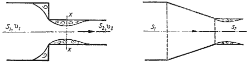 3. Внезапное сужение русла. В этом случае потеря напора обусловлена трением потока при входе в более узкую трубу и потерями на вихреобразование, которые образуются в кольцевом пространстве вокруг суженой части потока (рис.4.12).