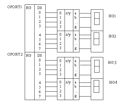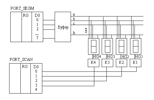 Порт вывода PORT_SCAN управляет ключами К1-К4, замыкающими цепи общих электродов индикаторов дисплея. Высвечивается только тот символ на индикаторе, ключ которого замкнут.