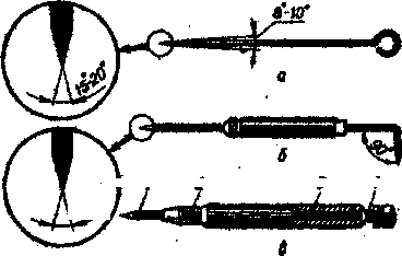 а - кругла; б - з відігнутим кінцем; в - з вставними голками (1 – голкаг: 2 - корпус: З – запасні.