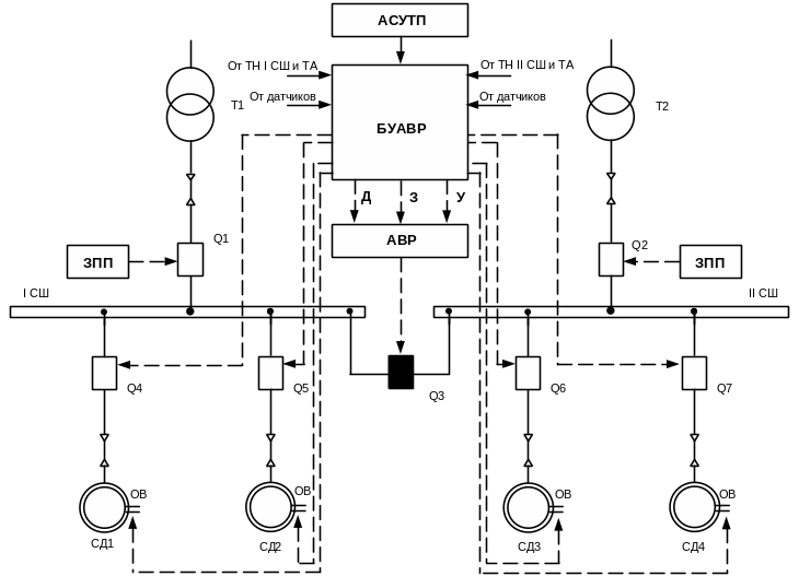 В системах электроснабжения предприятий при наличии двух источников питания, как правило, используется раздельная работа секций шин с отключенными секционными выключателями (СВ). Для восстановления электроснабжения потребителей, подключенных к потерявшей питание секции шин, применяются устройства автоматического ввода резерва (АВР). В эксплуатации находится большое количество АВР разных типов. Основные требования к устройствам АВР определяются технологическим процессом предприятия. Наличие крупных СД в схеме электроснабжения предъявляет к устройствам АВР дополнительные требования.