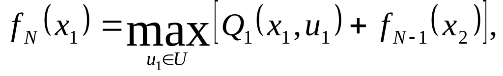 где fN(x1) – максимальное значение критерия оптимальности для N стадий процесса; Х1 и Х2 – вектора параметров состояния соответственно на первой и второй стадии; U1 – вектор управления на первой стадии; U – допустимое множество управлений; Q1(X1,U1) – значение критерия оптимальности для первой стадии; fN-1(X2) – максимальное значение критерия оптимальности для N-1 стадий процесса от последней стадии.
