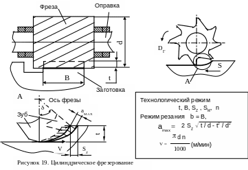 В процессе работы (рисунок 19) фреза располагается на оправке, закрепляемой на станке с двух сторон. Фреза совершает главное вращательное движение резания, перпендикулярно оси вращения перемещается заготовка (движением подачи), закрепленная на столе станка. В технологических картах обработки задаются частота вращения шпинделя n, подача на зуб SZ, минутная подача SМ, глубина резания t, и ширина фрезерования В. Физические параметры режима резания определяются следующим образом [3, c.259-264]: