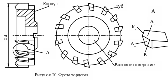 Торцевое фрезерование является основным способом обработки плоскостей. Технологические возможности - достижение 7 квалитета точности и шероховатости обработанной поверхности Rа 6.3-1.6 мкм. Торцевая фреза (рис. 20) представляет собой корпус, несущий на себе режущие элементы (зубья, ножи), расположенные на торце. Такая конструкция позволяет использовать фрезы большого диаметра со значительным числом зубьев, что увеличивает производительность обработки по сравнению с цилиндрическим фрезерованием, так как в каждый момент в контакте с заготовкой находится большое число работающих режущих элементов. Торцевая фреза является насадным инструментом, в процессе работы закрепляется на оправке, консольно зажатой в шпинделе станка. Базирование на оправке производится по цилиндрическому отверстию и верхнему торцу корпуса. Для передачи крутящего момента предусматривается осевая или торцевая шпонка.