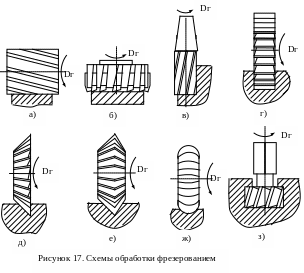 Фрезы - один из наиболее широко применяемых инструментов в металлообработке, фрезы отличаются большим разнообразием типов и конструкций. На рис.17 приведены примеры обработки цилиндрической а), торцевой б), концевой в), дисковой трехсторонней г), дисковой одноугловой д), дисковой двусторонней е), дисковой фасонной ж), для обработки Т-образных пазов фрезами. Для всех эскизов направление движение подачи перпендикулярно плоскости чертежа [3, c.255-256].