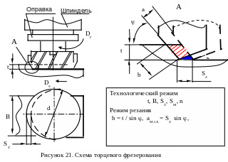 Скорость резания V рассчитывается так же, как при обработке осевым инструментом. Фигура, образуемая контуром зубьев за один цикл главного движения (1 / Z число оборотов) имеет форму сегмента. В расчетах сечения среза ширина b = t / sin . Толщина а является переменной величиной, максимальное значение aMAX = SZ sin .