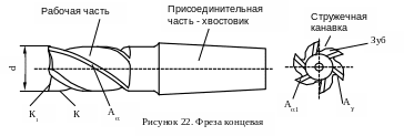 Концевая фреза (рис. 22) предназначена для обработки уступов, пазов и контурных участков детали. Рабочая часть фрезы образована винтовыми зубьями, разделенными стружечными канавками. Каждый зуб образуется передней главной А задней поверхностью А на периферии и вспомогательной задней поверхностью А1 на торце. Главная режущая кромка К - винтовая, вспомогательная К1 - прямая. Присоединительной частью концевых фрез является конический или цилиндрический хвостовик.