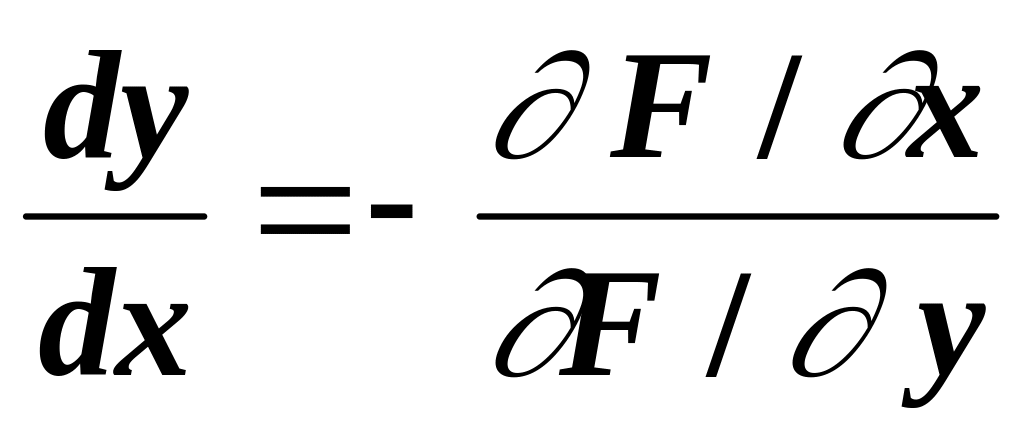 Теорема. Если непрерывная функция y=f(x) задана в неявном виде уравнением F(x,y)=0, и если частные производные Fx¢ (x,y) и Fy¢(x,y) непрерывны, то функция y=f(x) имеет производную для каждого значения x, для которого