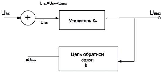 В большинстве аналоговых устройств на основе операционного усилителя используется обратная связь. Обратная связь – это процесс передачи части выходного сигнала на вход. Обратная связь бывает отрицательной, при которой сигнал обратной связи вычитается из входного сигнала, и положительной – когда сигналы складываются. Принцип отрицательной обратной связи, которая наиболее часто используется в операционных усилителях и показан на рис