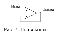 ПовторительНа рис. 7 представлен повторитель, подобный эммитерному, на основе операционного усилителя. Он представляет собой не что иное, как неинвертирующий усилитель, в котором сопротивление резистора R1 равно бесконечности, а сопротивление резистора R2 - нулю (коэффициент усиления = 1). Существуют специальные операционные усилители, предназначенные для использования только в качестве повторителей, они обладают улучшенными характеристиками (в основном более высоким быстродействием).