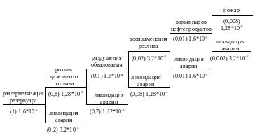 По данным годового отчета о деятельности Федеральной службы по экологическому, технологическому и атомному надзору в 2010 году, на территории Российской Федерации имеется 9198 организаций нефтепродуктовобеспечения, 2010 году на них зарегистрировано 15 аварий. Следовательно, риск возникновения аварий на объектах нефтепереработки и нефтехранения составляет 1,6*10-3. Риск развития сценария рассчитывается с помощью дерева событий рис 2.