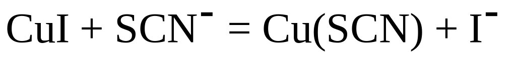 Источником существенной отрицательной ошибки результатов титрования является адсорбция иода (корректнее – трииодид ‑ иона) осадком CuI. Трииодид ‑ ион настолько прочно удерживается поверхностью осадка, что реакция между тиосульфатом и трииодидом (иодом) не проходит до конца. Это можно избежать, если в раствор при приближении КТТ добавить небольшой избыток тиоцианата калия. При этом на поверхности выпавшего осадка будет протекать реакция обмена: