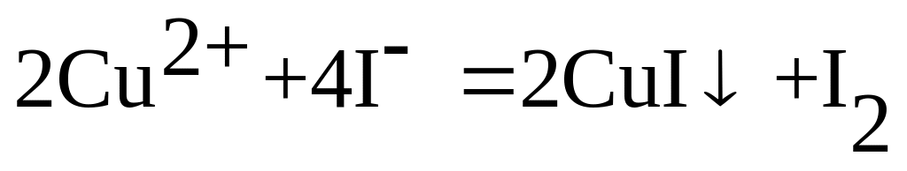 Ион водорода не принимает участия в реакции, однако значение pH влияет на скорость процесса, а также на правильность определения из ‑ за возможных побочных процессов гидролиза (образования гидроксокомплексов меди при pH > 4) и инду–цированного окисления иодида калия кислородом воздуха (при [H+] > 0,3 моль·л–1).
