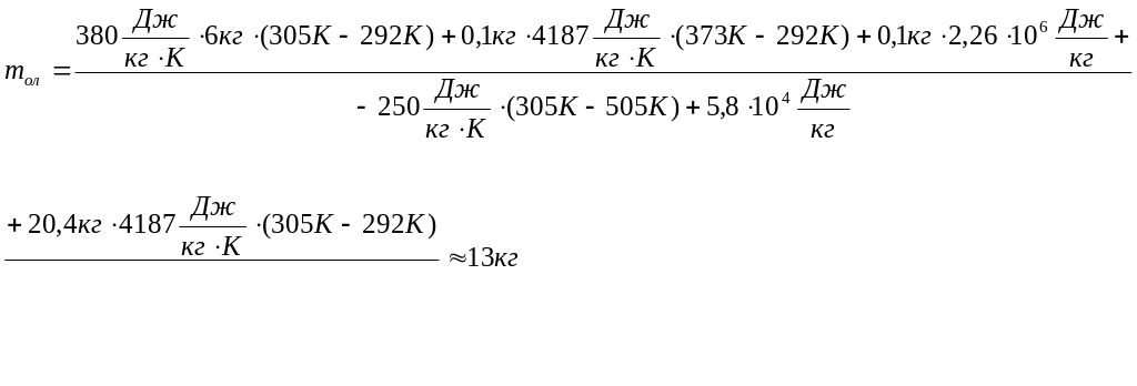 Дано: mм=6 кг Vв=20,5 л tв=190С tол=2320С mв1=0,1 кг =320С |
