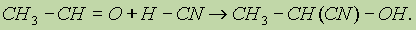 1. Реакция с циановодорооной (синильной) кислотой. Реакция имеет важное значение в органической химии. Во-первых, в результате реакции можно удлинить углеродную цепь; во-вторых, продукты реакции — гидроксинитрилы — служат исходными соединениями для синтеза гидроксикарбоновых кислот: